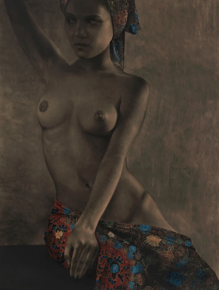 Dato’ Azman Yusof is a celebrated Malaysian artist whose practice spans illustration, cartooning, and painting, marked by exceptional technical control and sensitivity to form. Renowned for his refined handling of light and shade, his paintings demonstrate a sophisticated understanding of the human figure, where subtle tonal transitions gently model the body and create a sense of depth, warmth, and presence. His meticulous approach extends to surface detail, particularly in the rendering of textiles, where batik fabrics are captured with remarkable attention to drapery, pattern, and texture, enhancing the realism and tactile quality of his compositions.